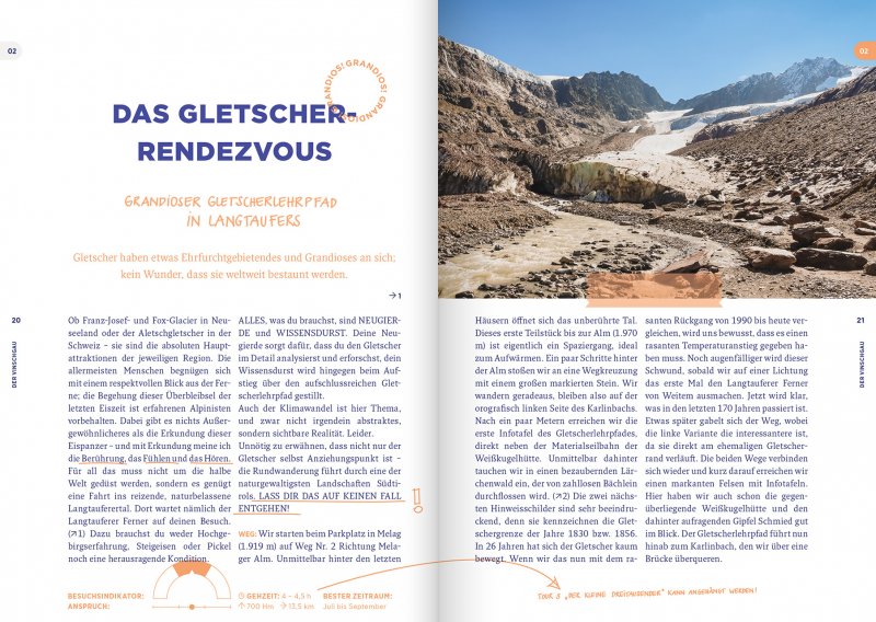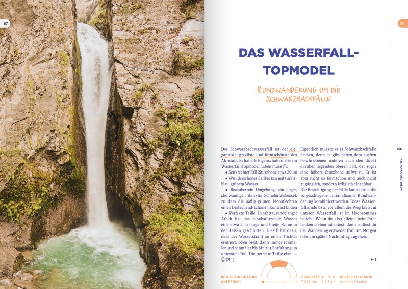 Es handelt sich nicht um einen „klassischen“ Wanderführer, sprich eine Auflistung von verschiedenen Wandermöglichkeiten, sondern um ein Outdoor-Guidebook. Diese englische Bezeichnung (eine zutreffende deutsche Übersetzung habe ich bislang noch nicht gefunden; fällt dir vielleicht eine ein?) bringt es exakt auf dem Punkt – das Buch beschreibt Erlebnisse in der Natur. Diese sind ganz unterschiedlich: eine anstrengende und lange Gipfelbesteigung bis hin zu einen kurzen Abstecher zu einen tosenden Wasserfall. In einem Tag sind so auch mehrere Touren möglich.